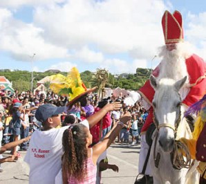 Little hearts beat a little faster between mid-November and early December, fascinated but also a little scared, as Sanikolas and his Petes (helpers) dock their big steam ship (all the way from Spain!) in our Saint Anna Bay. Children keep an eye out for Sanikolas’ white horse… anxiously awaiting his visit… and burlap sack filled with their favorite toys and books, initials in thick milk or dark chocolate, candy, pepernoten (ginger snaps), and taai taai (stiff “tough tough” cookies).