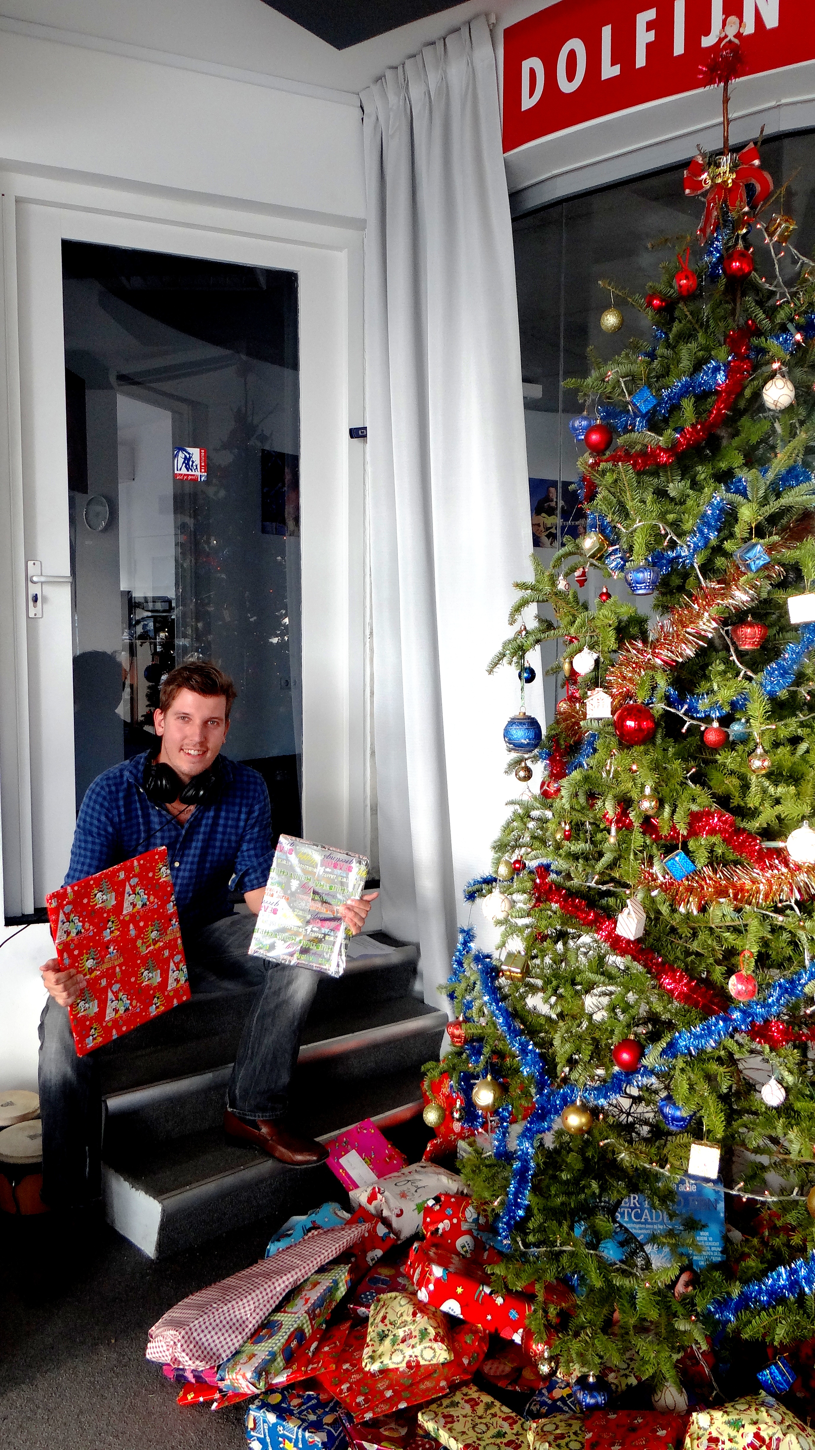 Maarten surrounded by gifts.